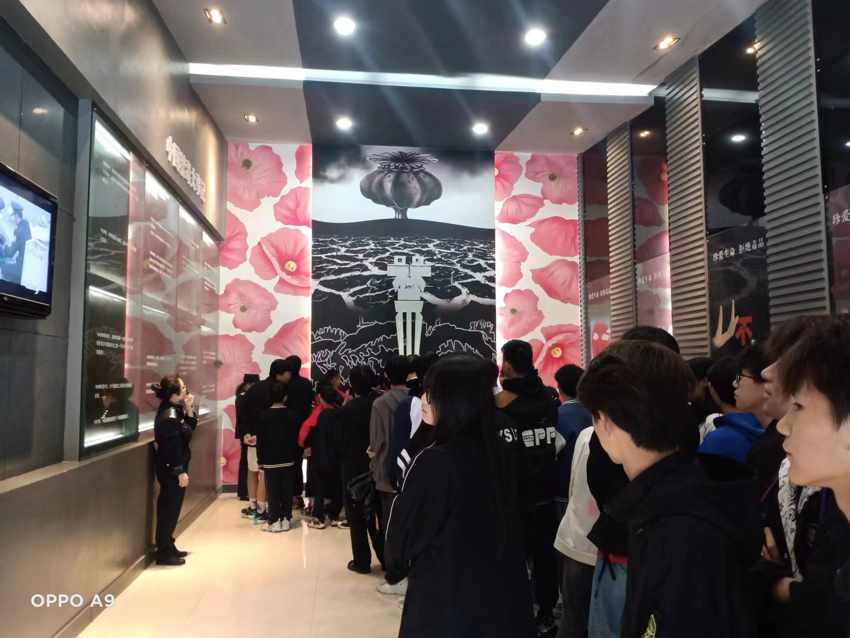 在戒毒所工作人员和警官的带领下,同学们来到了基地展厅,工作人员从毒品的由来到第一次鸦片战争、从传统毒品到新型毒品、从认识毒品到毒品对身体的伤害、从吸食毒品的人群到吸食毒品的工具等,基地通过展板、海报、实物、视频等方式让学生真正认识到毒品、了解到毒品对身体带来的危害,使在场的同学们受到了极大的教育。