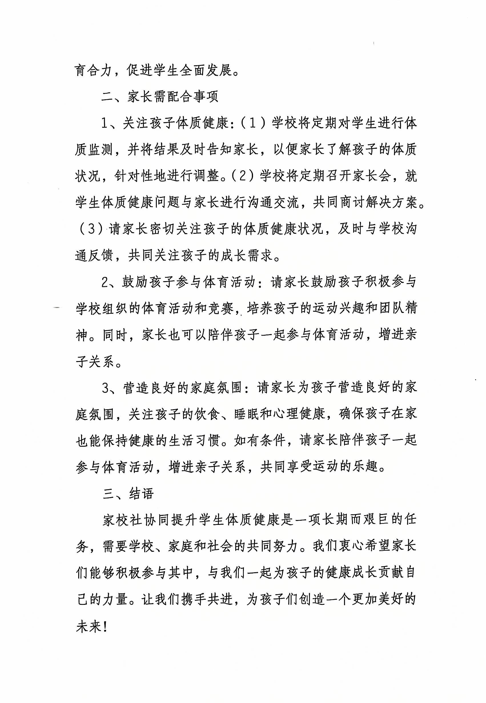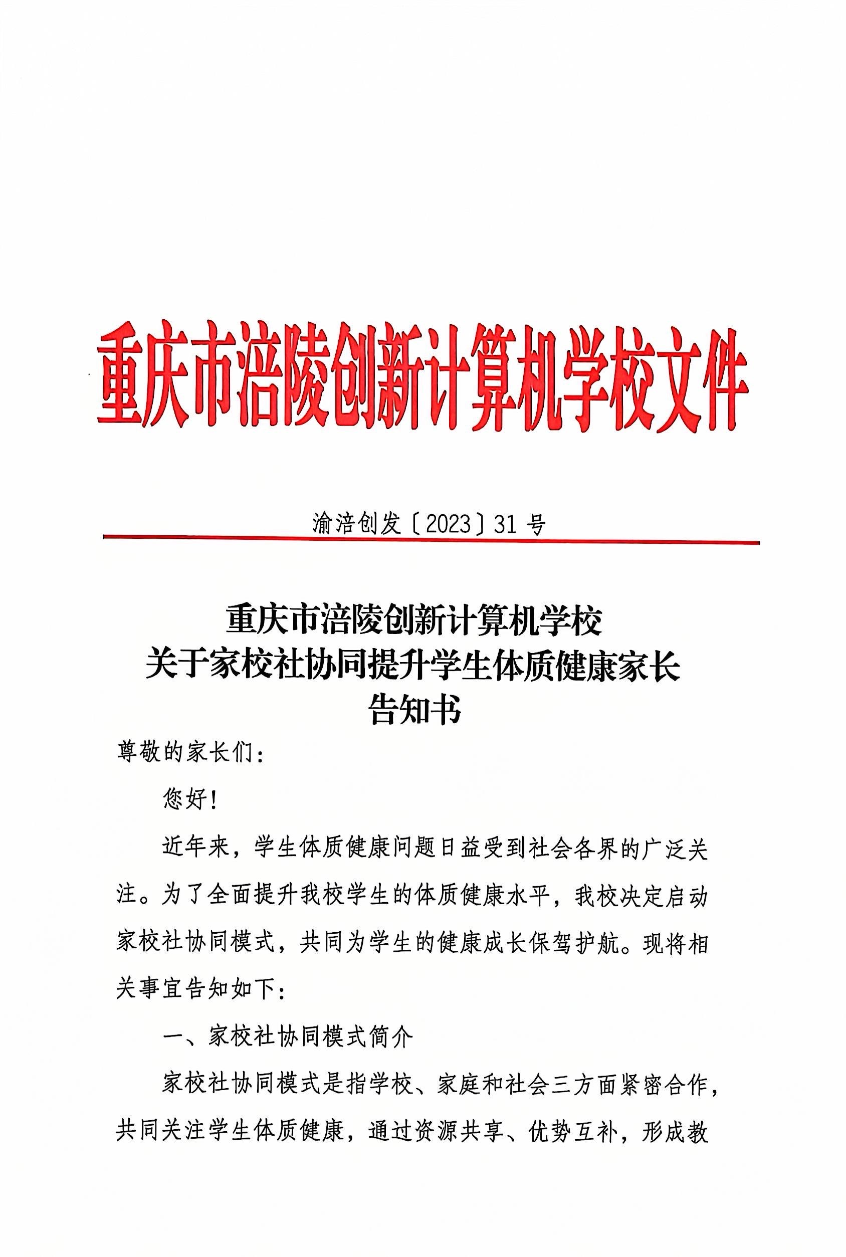重庆市涪陵创新计算机学校关于家校社协同提升学生体质健康家长告知书